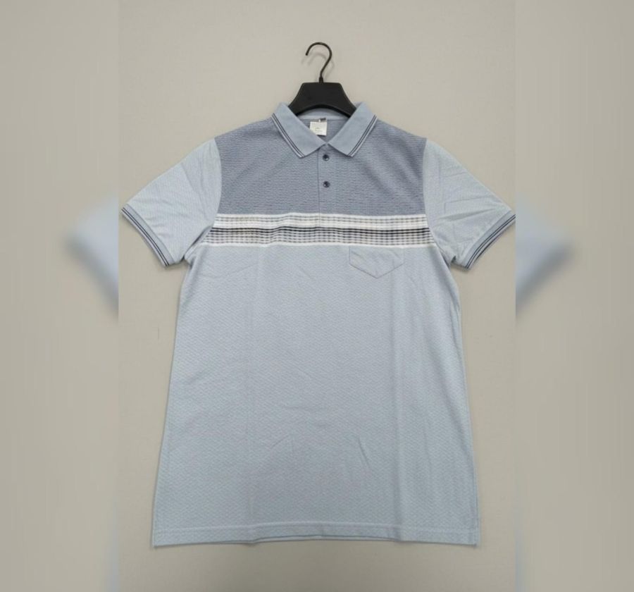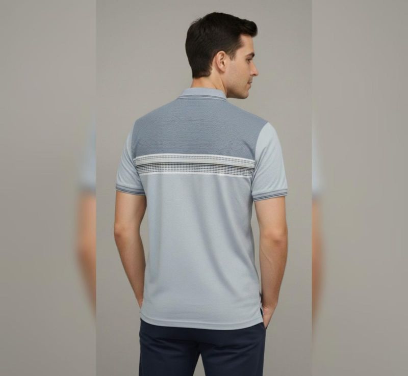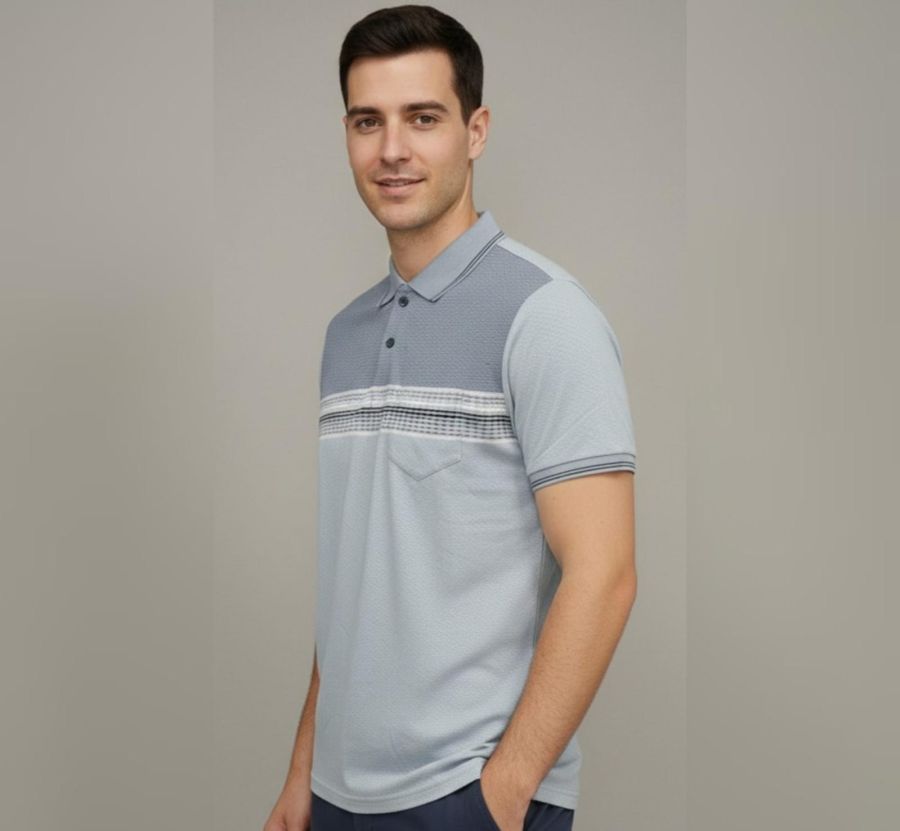 Color: Multi-tone Blue (Light Blue base with Slate Blue yoke and Navy/White accents) Fabric: Premium textured cotton-blend (honeycomb/pique knit) for breathability and a soft feel.