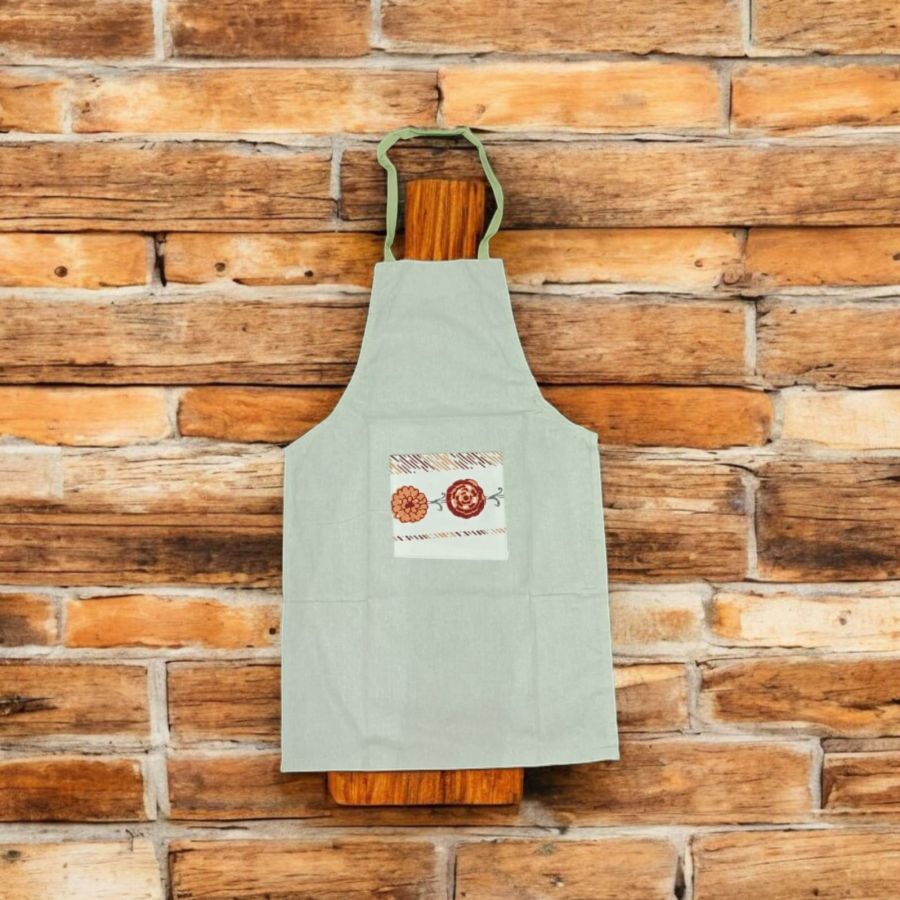 A full-length bib apron, covering from the chest to just above the knees (about 30–36 inches long, 27–34 inches wide), protecting against spills and stains.