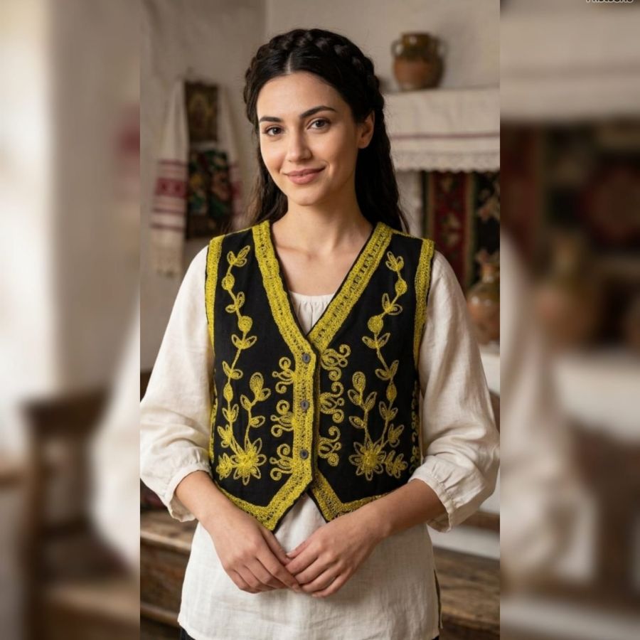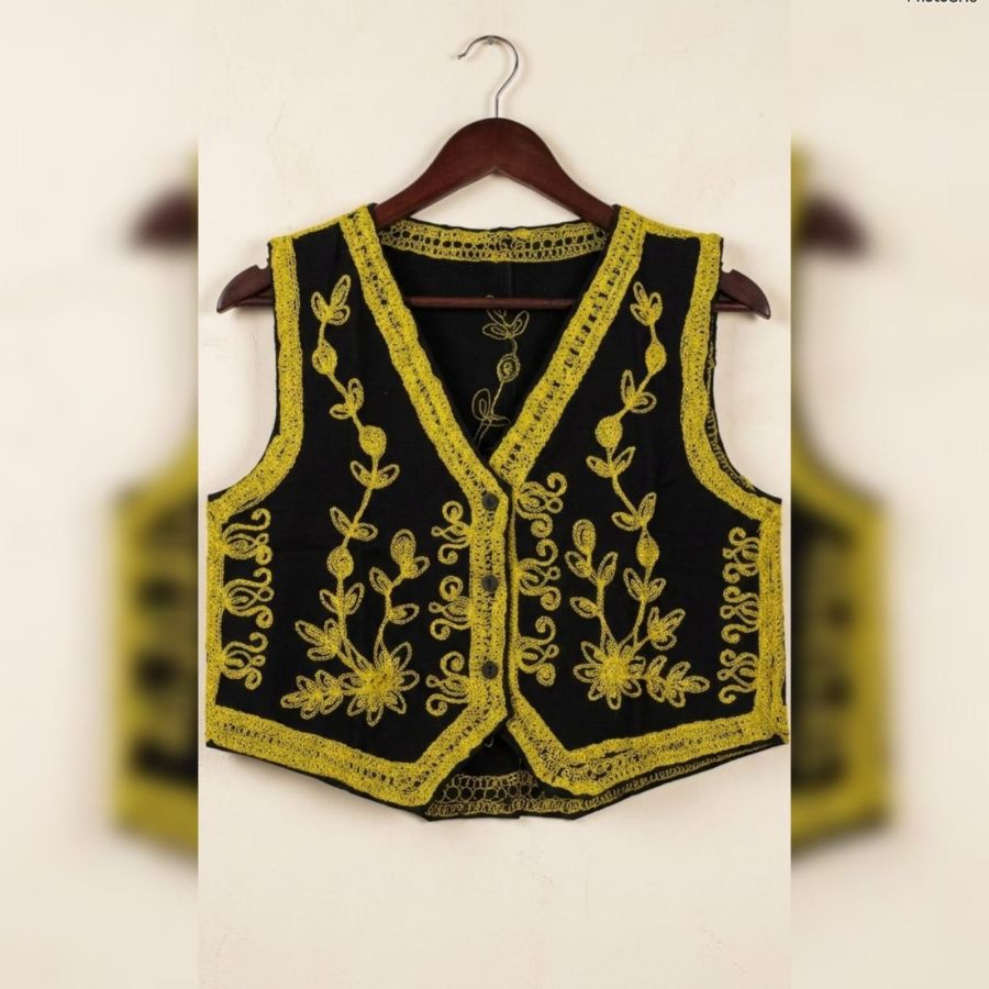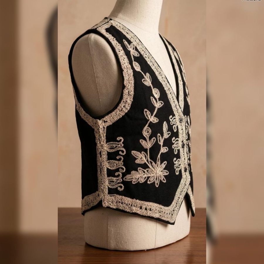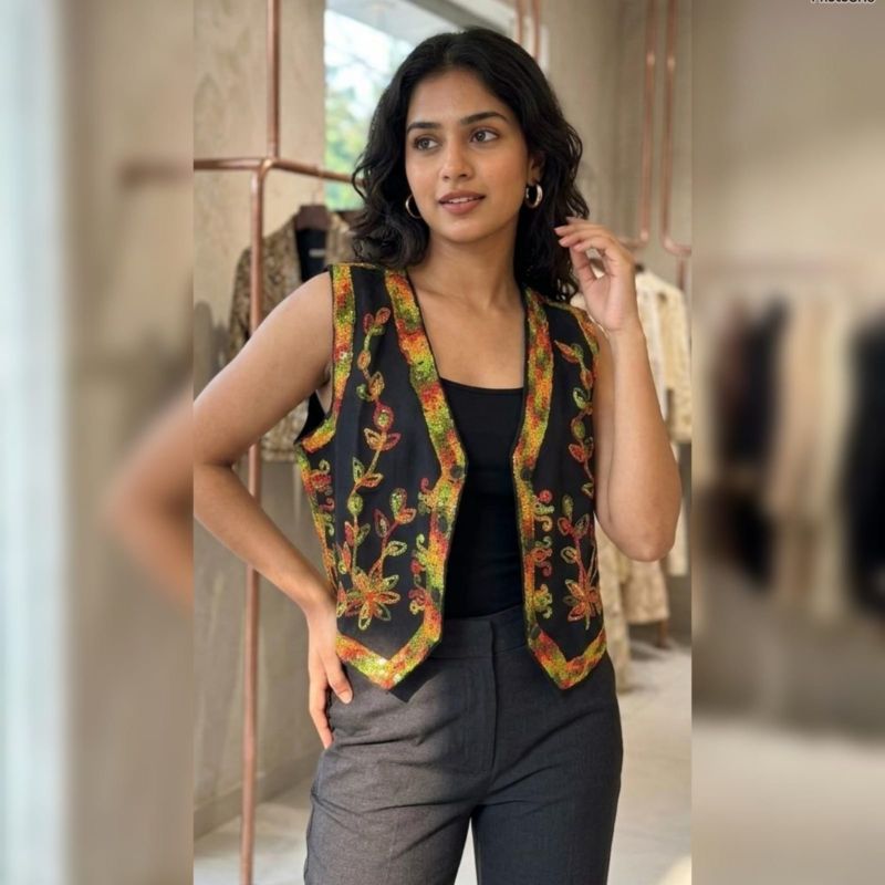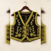 An exquisite ethnic waistcoat (Koti) crafted from premium black velvet. It features intricate silver pinstripe-style Zari embroidery with delicate floral and vine motifs. This sleeveless jacket is designed to be layered over shirts, tunics, or kurtas to instantly elevate a casual look into a festive or semi-formal ensemble.
